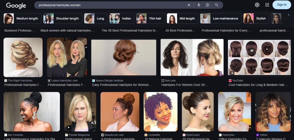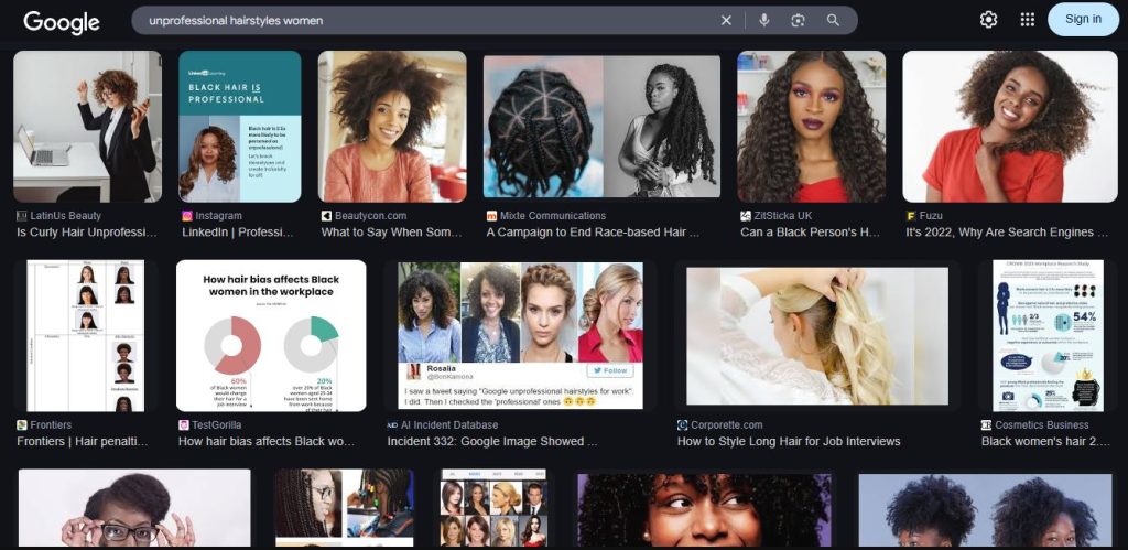 Pour être témoin de ces biais algorithmiques, il suffit de se diriger vers Google, le champion en titre des recherches Internet. Par une simple recherche (sur un navigateur privé vierge sans préférences précédentes) des termes « style de coiffure professionnelle pour femme » et puis « style de coiffure non professionnelle pour femme », on constate que les résultats pour la deuxième recherche montrent surtout des coiffures associées aux personnes racisées, tandis que les résultats de la première recherche mettent davantage en vedette les coupes de cheveux blondes, brunes ou noires typiquement associés aux personnes blanches.