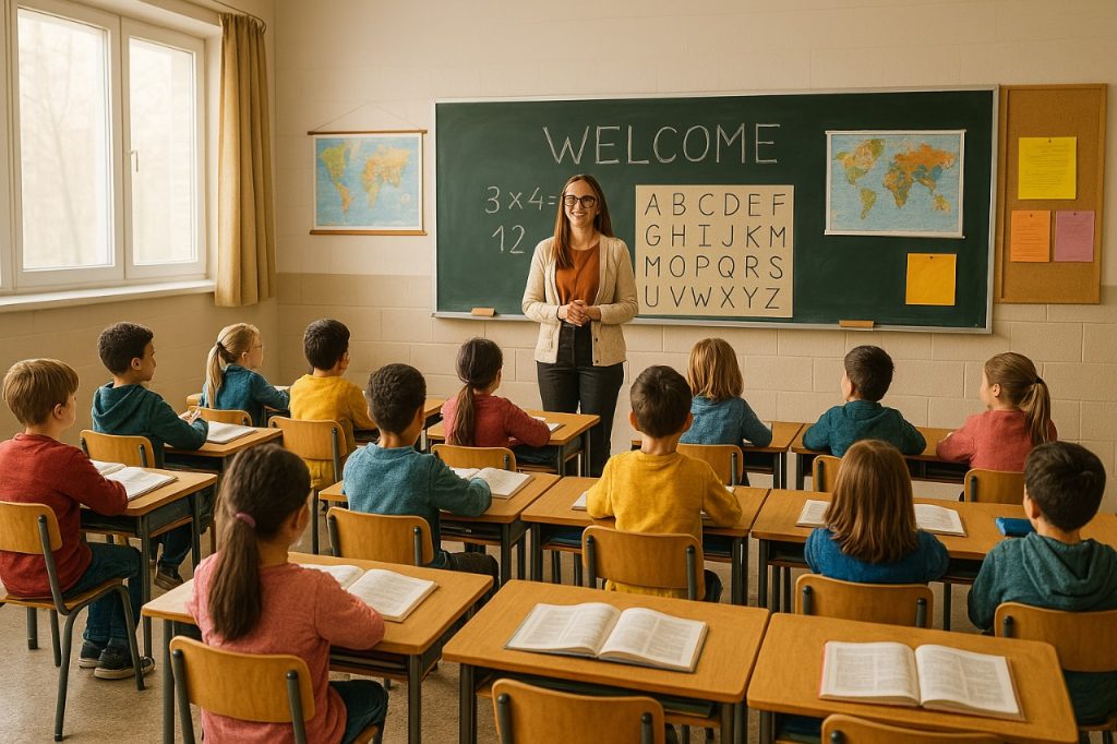 Open IA via ChatGPT, a généré une image d’une classe scolaire de jeunes personnes étudiantes en train d’observer leur professeure.