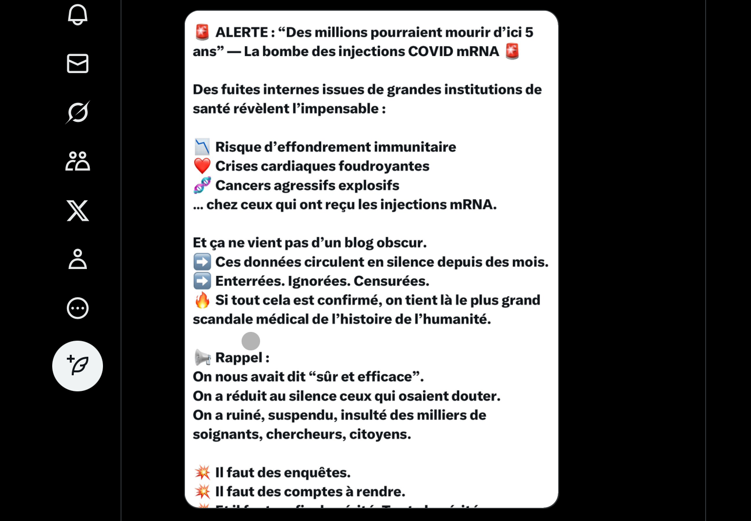 La publication trouvée sur X ci-dessus s’appuie sur des informations partagées à propos de la COVID-19 et cherche à orienter l’opinion publique vers un courant de pensée anti-vaccin. Elle témoigne vraisemblablement d’une forte opinion concernant les supposés mensonges du gouvernement au sujet du vaccin.